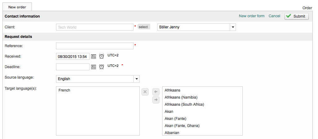 By tailoring your classic order form, users will have an easier time completing the form. For example, if no source or target languages have been configured, every language will be a selection choice on the form. This is time consuming and increases the risk of errors.
