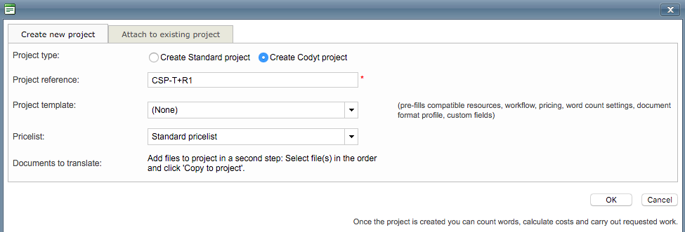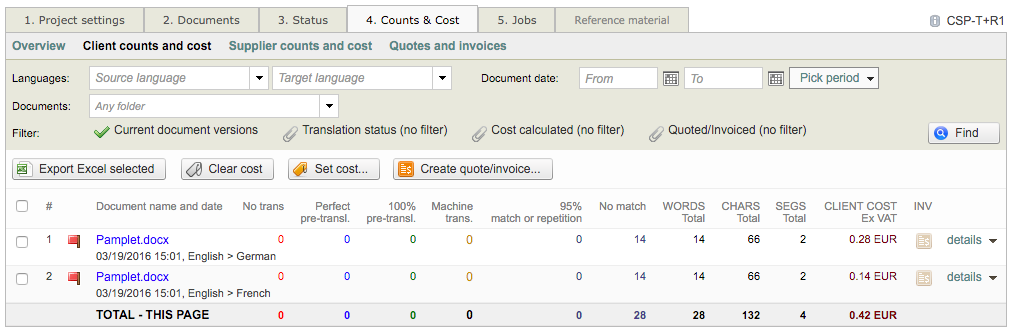 Wordbee will perform a word count automatically for CoDyt projects and calculate the cost based on the chosen pricelist. After clicking on OK, you will be returned to the Counts & Costs Tab where the cost of each document will now be displayed.