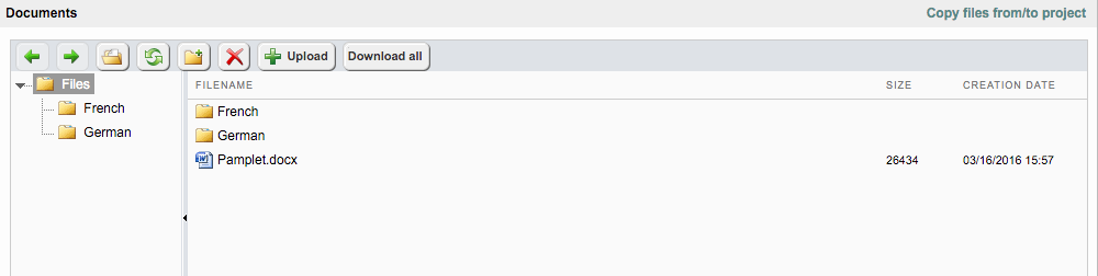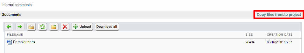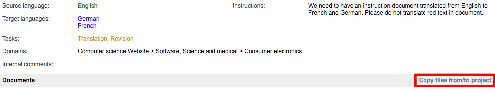 You will be returned to the Order Details Tab. Scroll down to the Documents Section and click on Copy files from/to project. Then choose Copy files to project within the provided drop-down menu.