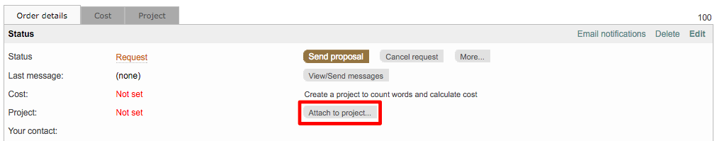 Now that the client has been added to the system and assigned to the order, you will be able to create a project, enter pricing information, calculate costs, and propose jobs to suppliers. To begin, the first task will be creating a project in the system for the order. Click on Attach to project... on the Order Details Tab.