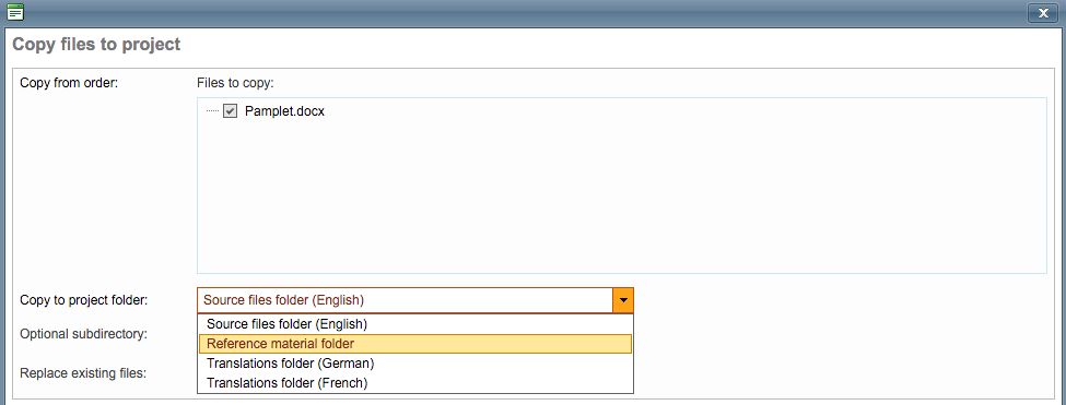 Just choose the files underneath Files to Copy and then choose the appropriate folder in the Copy to Project Folder drop-down menu. In the example below, only one document is being copied and needs to be placed in the Source folder for translation and revision.