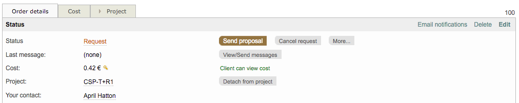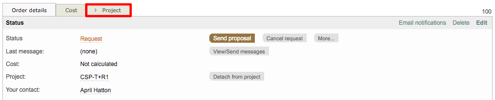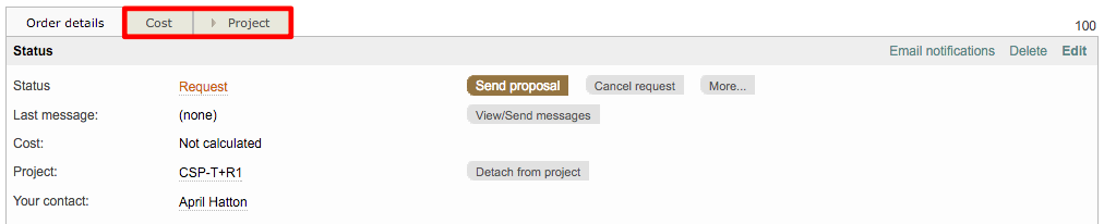 You will be redirected to the Order Details Tab. It is now possible to click on the Cost and Project Tabs for the order: