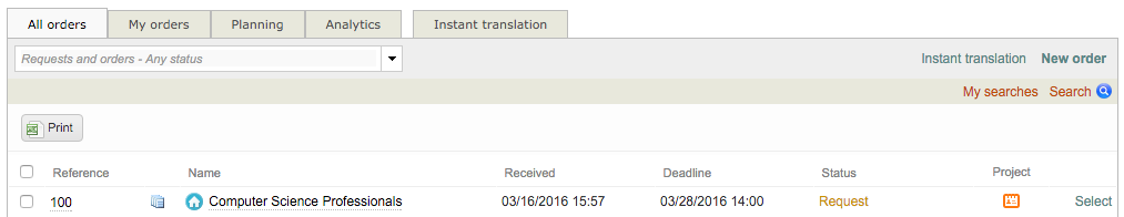 If the order is viewed again by clicking on Orders in the Menu Bar, you will now see an Icon underneath the Project Column to show that a project exists for the order.