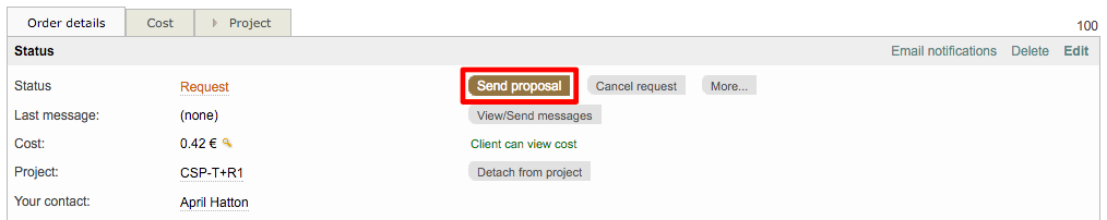You will need to view the details for the order by clicking on Orders and then clicking on Select for the appropriate one. On the Order Details Tab, click on Send Proposal.