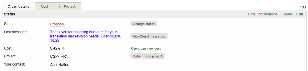 Now that the project has been created in the system, you will be able to make pricing changes, mark the document for translation, perform a word count, calculate the cost, and so on. Click on the Project Tab to access the project details for the order.