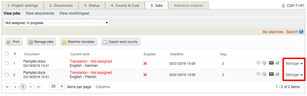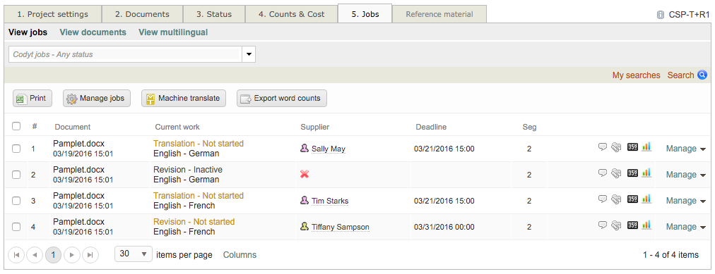 The Jobs Tab will now show each job, the document, the work, the supplier who was assigned or sent a proposal, the deadline, and the number of segments. The suppliers will receive an email (if notifications were enabled) and can accept the proposal from the email or by logging into the client portal.