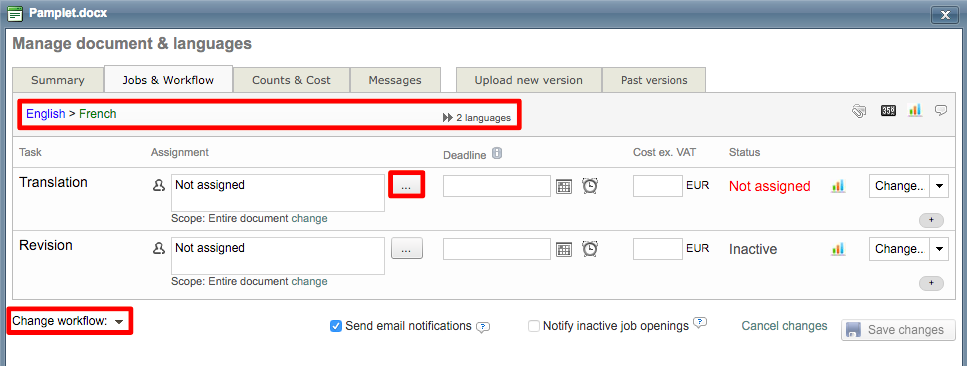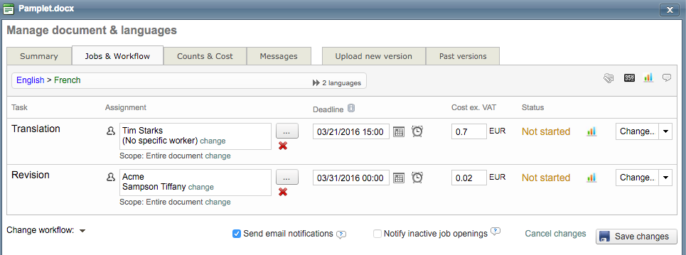In this example, there are two different translation and revision tasks (German and French) for the English Source Language. You will need to use the drop-down menu to choose a target language and then select the suppliers for each language pair. The following may also be done in this pop-up window: