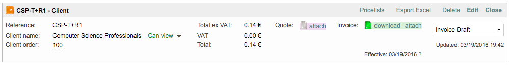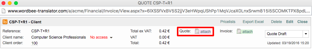 Once the quote draft has been created and attached to the project, the Quotes and Invoices section will appear as shown below. The quote can be printed, downloaded, exported, etc.