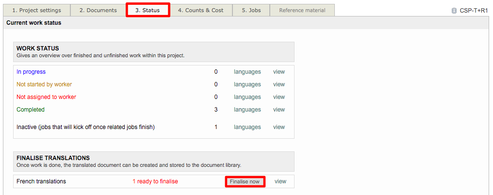 This tab displays the work status of the project and is used to finalise translations after all work has been completed.