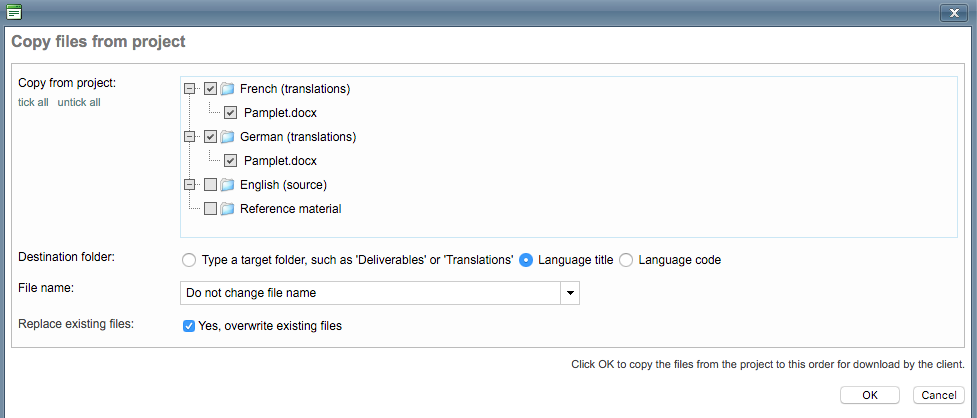 You may also change the destination folder for the copied files (if desired). By default the files are copied to the appropriate language folder (English, French, German, etc.). Additional options include changing the file name and disabling the option for overwriting existing files. Once finished, click on OK to copy the files to the order.