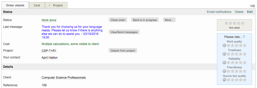 Once the the above steps have been completed, the Order Details Tab will appear as shown below when viewing the order. You have the option to rate quality, timeliness, source text quality and more. To learn more about ratings, please see the User Ratings section in Administration.