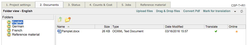 If the document does not need to be translated, you can click on Translate Yes/No and then Mark for no translation. Documents marked for online translation will have a green checkmark in the Translation Column and a star in the Online Column.