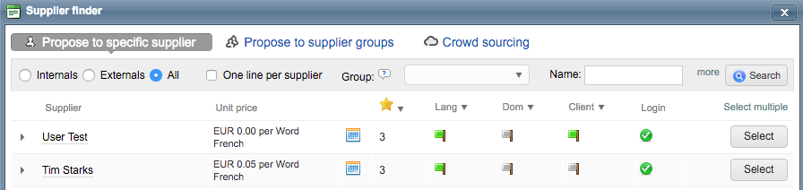 The pop-up window will show the unit price, language, rating, etc. Click on Select to choose a supplier or tick the checkboxes when choosing a supplier groups or crowd sourcing.
