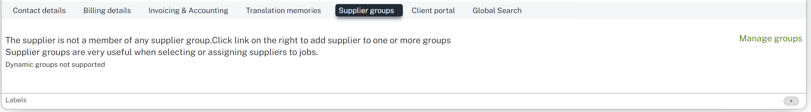 Group sourcing will allow you to create your own groups based on your own, trusted suppliers. Depending on your client expectations, you may want to have your clients involved in the workflows to perform revision or validation steps. As a manager you will have the possibility to add them to specific supplier groups to dispatch these jobs easily. This tab shows the groups the client is included in.