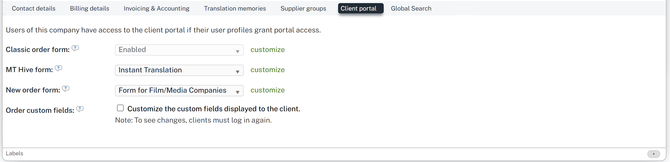 If you are using the Order form to register client requests in the system to perform any linguistic work within a project, you will find in this section which is the form enabled for the client company. If you want fully customized forms, you may also specify which of the custom order fields must be available to client users during and after order submission.