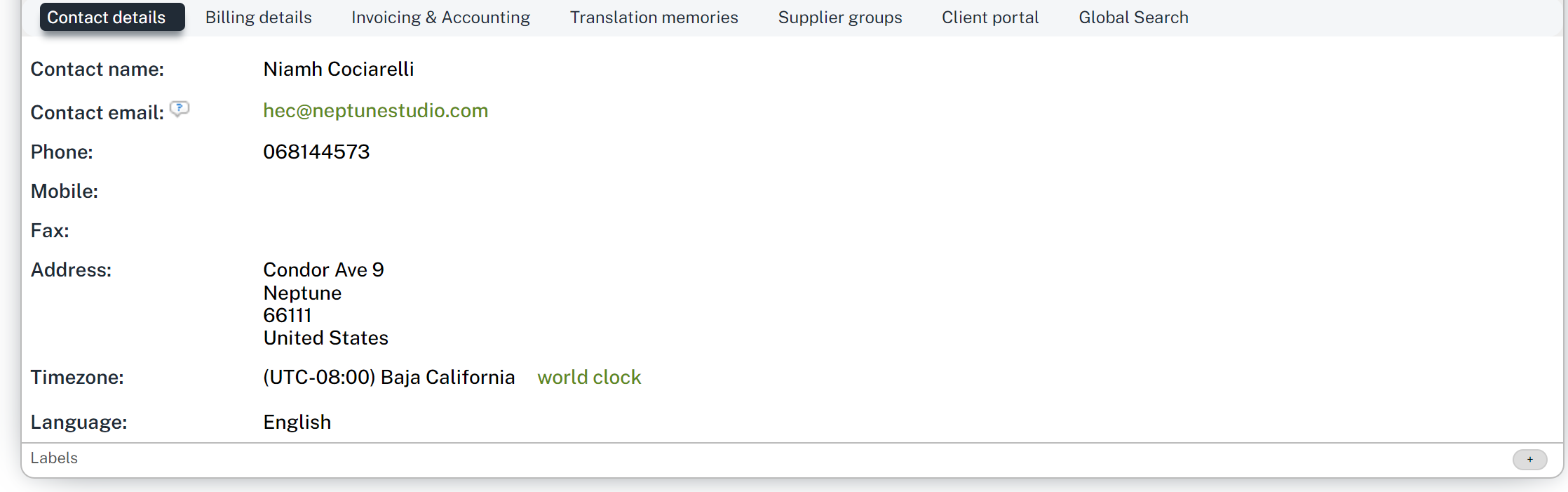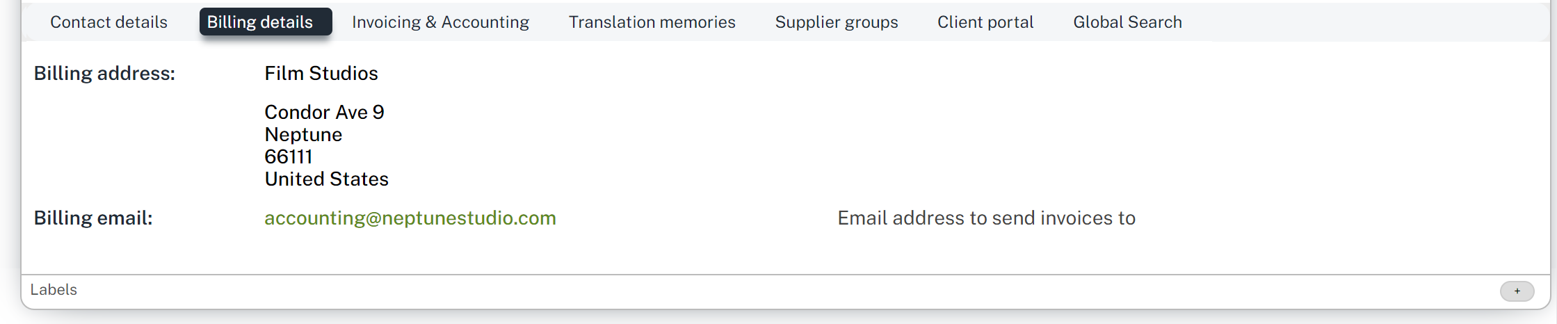 Displays the billing information for the client company including their billing address and billing email. The billing email will be used to send invoices to the supplier and you can click on it to send a message.