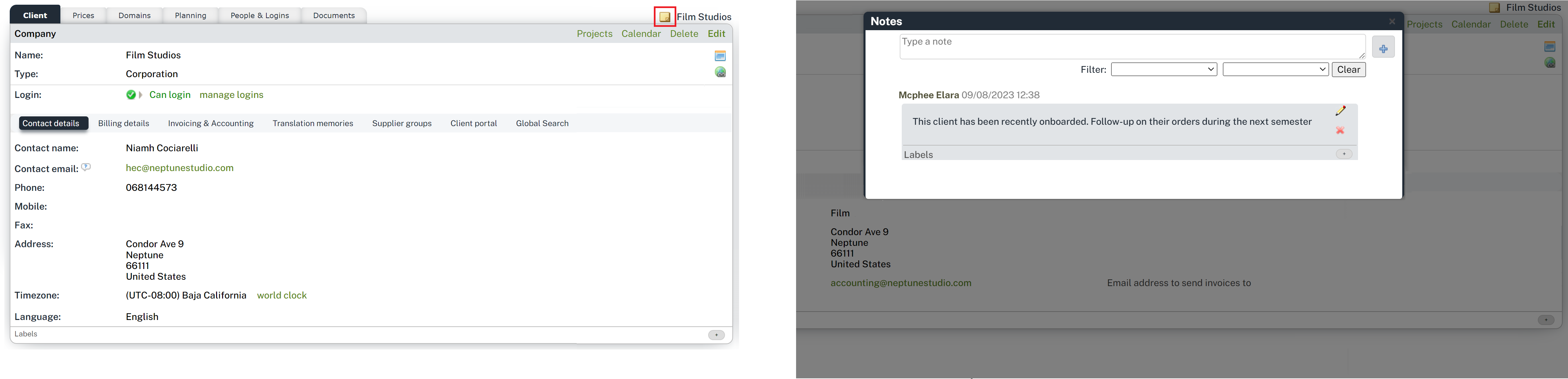 If they are available, the Post-it icon next to the client company name on the top right corner will be colored, depending on if it is empty (gray) or if it already has some content (yellow).