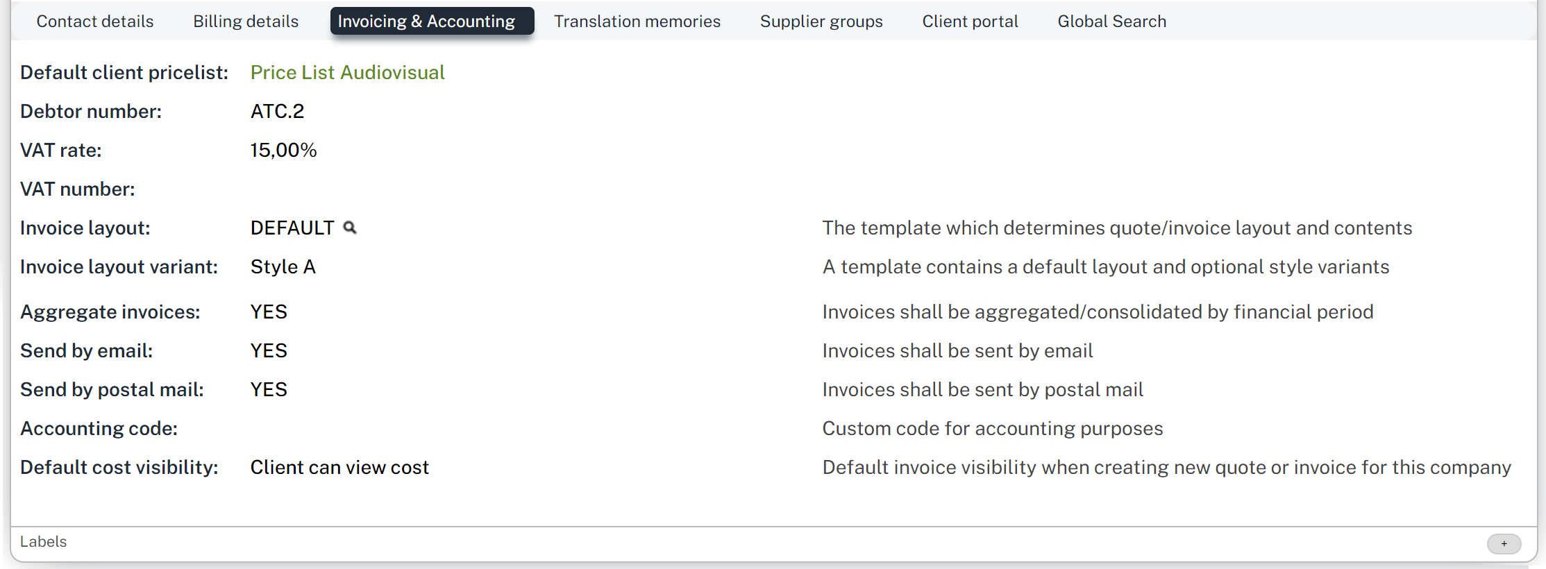 Displays information related to invoicing and accounting including the preferred pricelist used for the client, the debtor number, VAT rate, VAT number, invoice layout, and currently enabled/disabled settings.