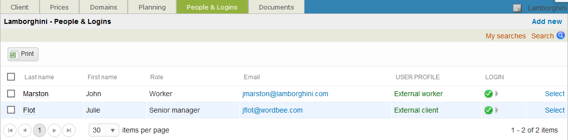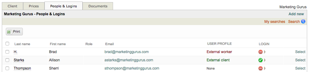 The People & Logins Tab displays a list of current user logins for the client. It can be used to view the information for a user, to make changes, to add new users, and to manage logins. To access it you will need to: