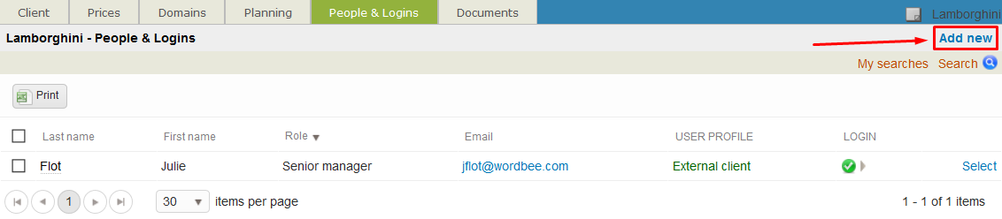 On the People & Logins Tab, an option is provided to add a new user. To do so, click on Add New in the upper right corner and then enter the user's information.