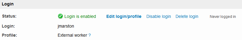 In the Login Section of this tab, several options are provided to manage user logins. Additional information is provided to show if the login is enabled and the last time the user logged into the system.