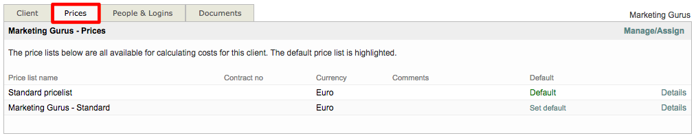 - Manage/Assign - Manage pricelists in the system (edit, create, assign, etc.). This will direct you to My Company > Prices Tab. For more information, see Client Pricelists.