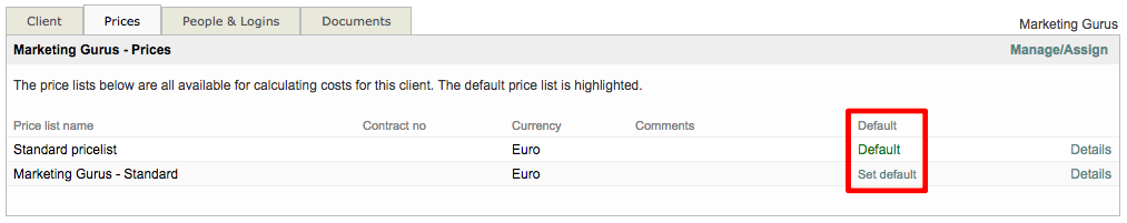 The Default pricelist applies by default for clients in the system. Another one can be set by clicking on Set default. The default one will be automatically populated when choosing the client for a project.