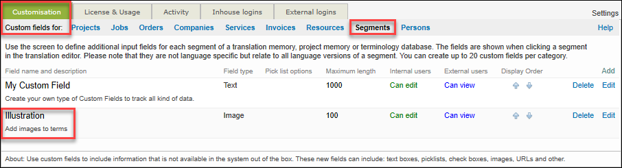 In the Customization screen, open the Segments tab to define additional input fields for your translation memories and terminology databases. The fields you define here will visible in the Translation Editor. You can create up to 20 custom fields per category.