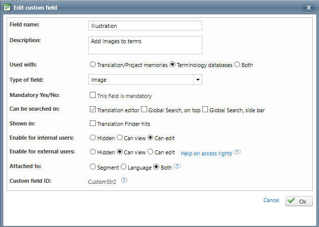 Wordbee automatically assigns the custom field an internal custom field ID for advanced use cases. As soon as you click OK, the custom field is listed in the Custom Fields for Segments. You can now add an illustration to your terminological entries.