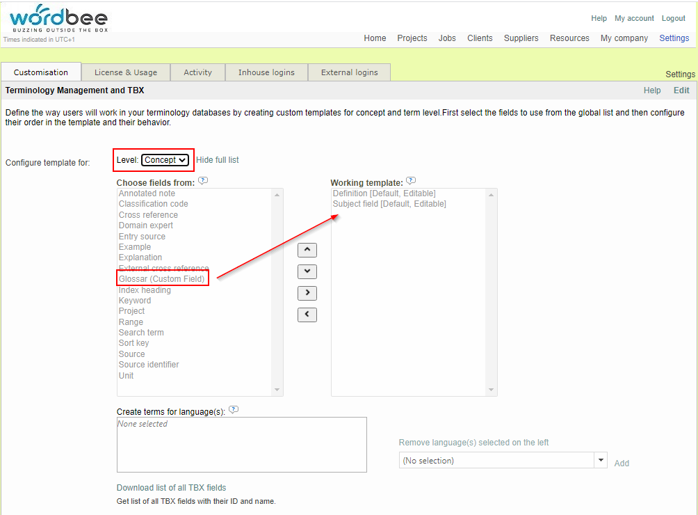 In the global list of fields, select the custom field you have just created and push it on the concept or term level to the working template.