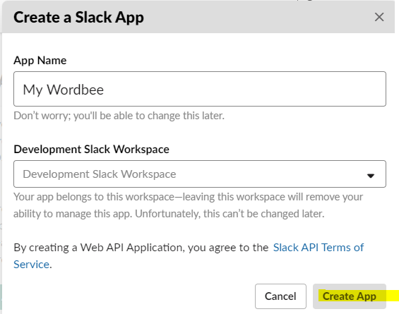 A popup opens prompting you to name the app. Select your Slack workspace and confirm: