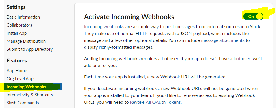 You will be redirected to a new page. Click Incoming webhooks on the left and then tick on webhooks in the right-hand side as shown below: