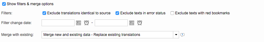 Additional options include entering a filter change date range. If dates are entered here, then only translation changes within that range will be merged. The following merge options are also provided: