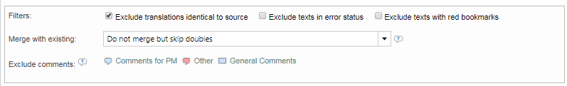 The first two filters (translations identical to source and texts with red status) are checked by default and recommended for any project memory consolidation.