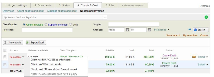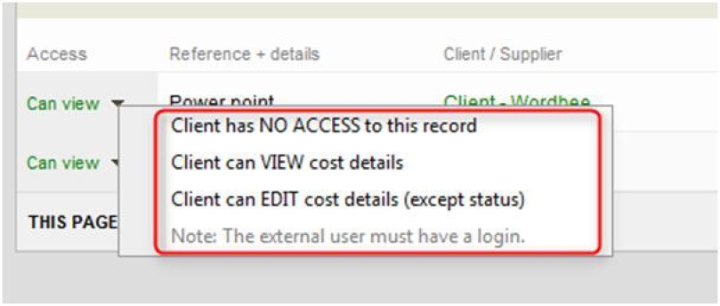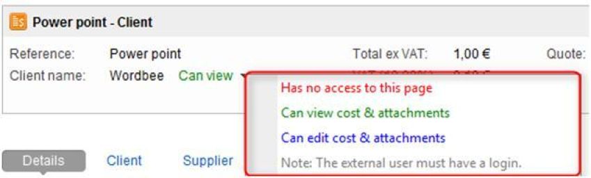 You can see that in the example shown in the screenshot above: the client has no right access to the cost details. You can change this feature by clicking on the arrow next to Noaccessand choose among the three options shown in the screenshot below: