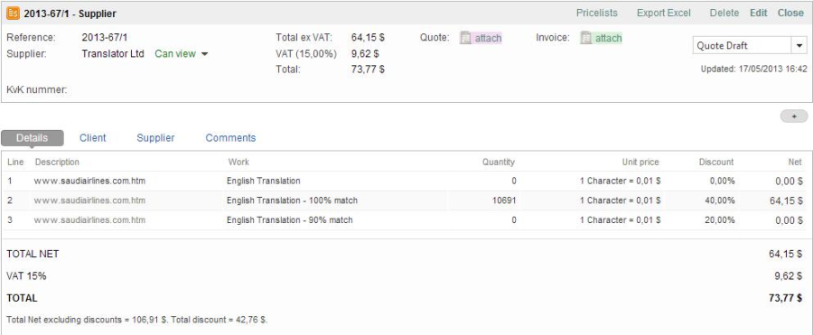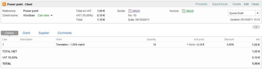 The total is useful if you create several quotes and invoices and you want to see how much it is going to cost you. Everything is automatically calculated based on the number of words and the prices of the different clients and suppliers.