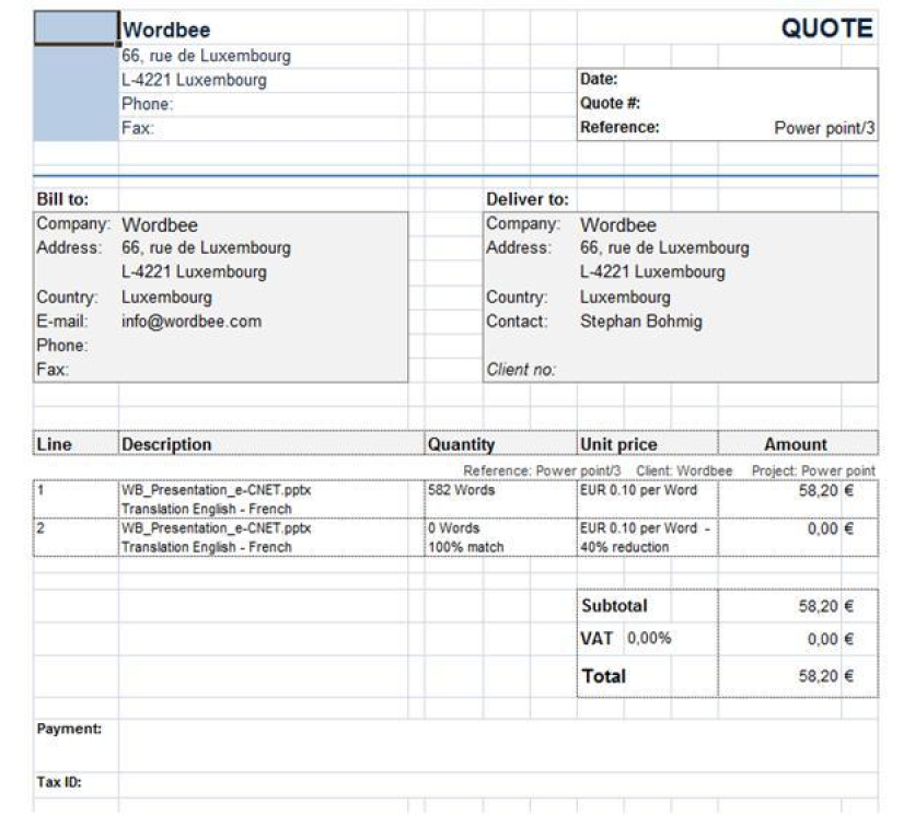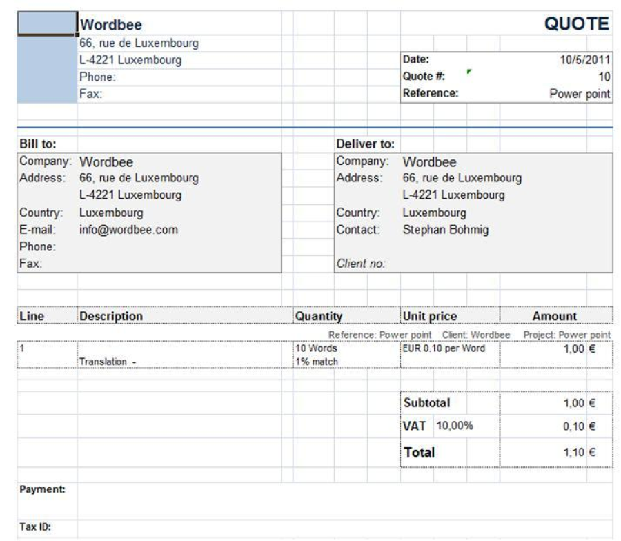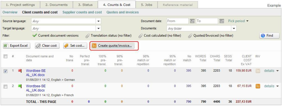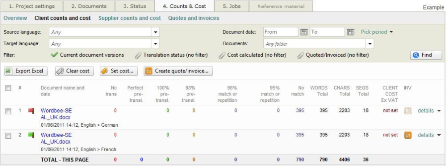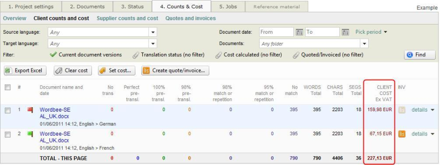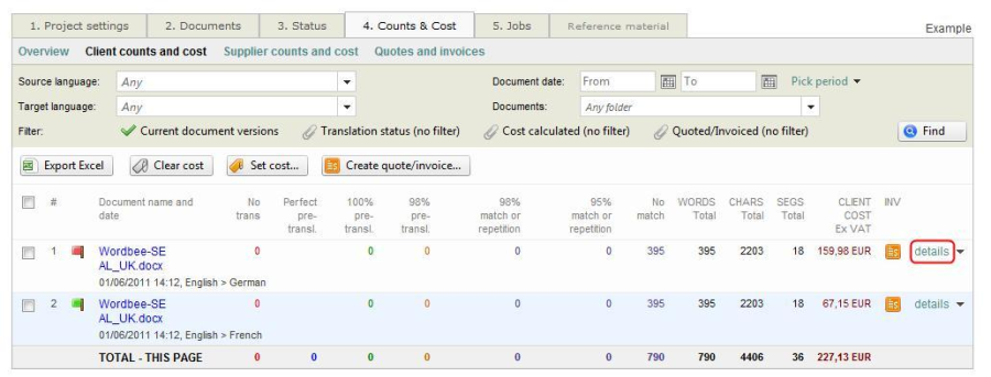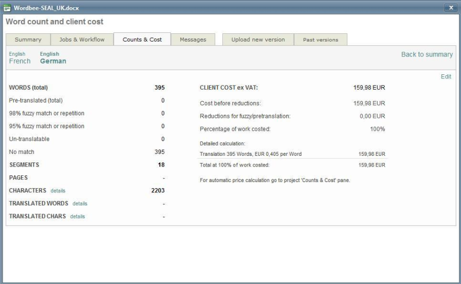 Wordbee automatically calculates the total cost based on the number of words, the price per word...