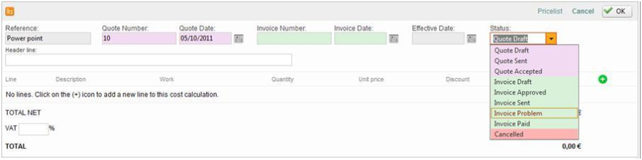 When everything is set up, click on Close (right top of the page) and go back to the Cost page of the project. You will see that a new invoice/ quote have been created.