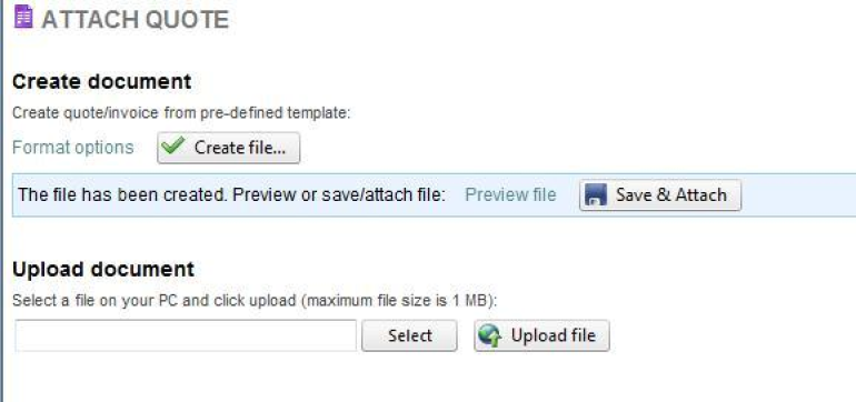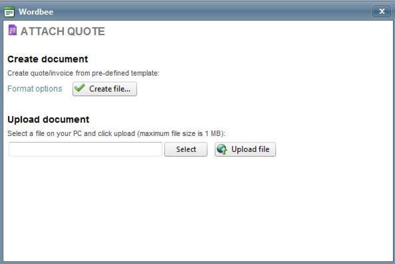 Now, click on Attach next to Quote or invoice to either upload a document you have in your computer (Upload document sub-section) or to insert a professional quote/invoice created by Wordbee (Create document sub-section).