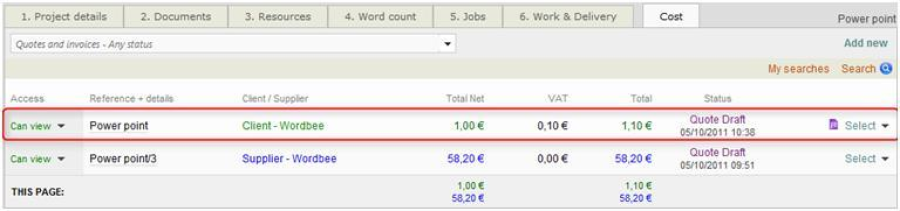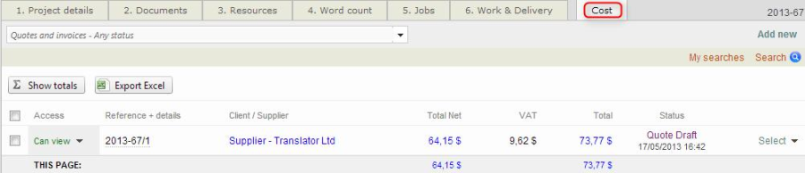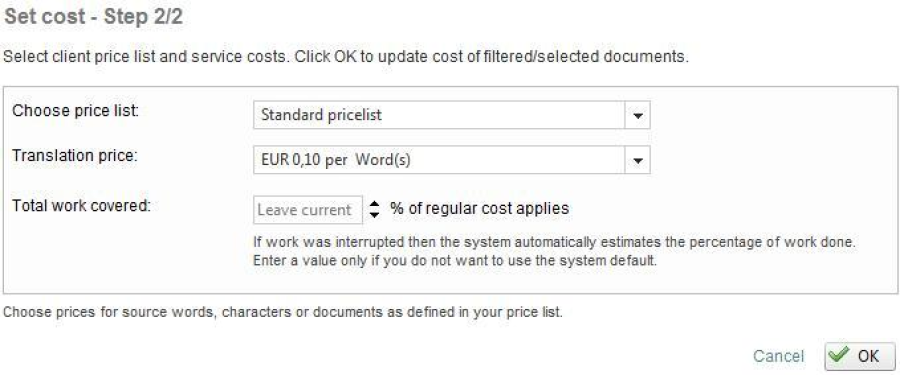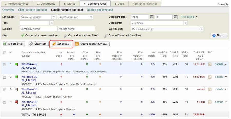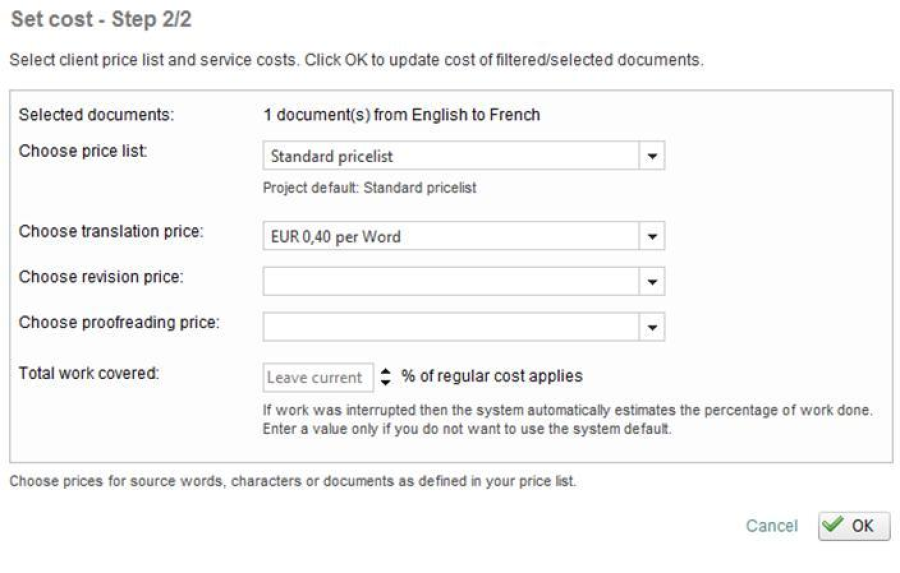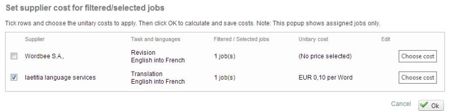 Whenever you choose a supplier to do a job, the cost is automatically calculated based on theprice/word of the supplier and the number of words translated/revised...
