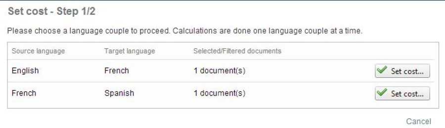 Click on Set cost (see screenshot above) , after having selected the task for which you want to establish a cost by ticking the box situated at the left of the document's name (if you want to set the cost for all the jobs, do not select any of them and click directly on Set cost).