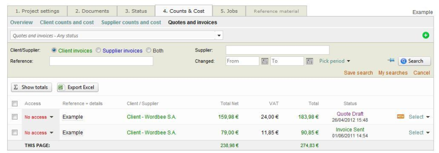 Go back to either Client counts and cost or Supplier counts and cost, depending on for whom you have sent the recently invoice/quote created. Theicon will give you some information about the quote you created.