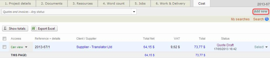 If you need to create a new invoice/quote, go back to the Cost tab of the project and then, click on Add new: