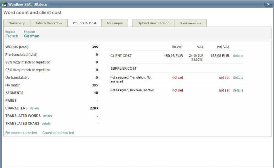 On this page, you can see the Word count on the left and the Supplier/Client cost on the right.