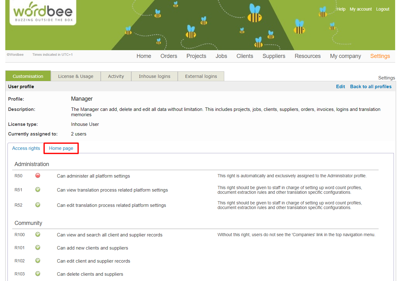 When viewing the Access Rights for a specific profile, you will find a second tab which allows you to do customise the Home dashboard.