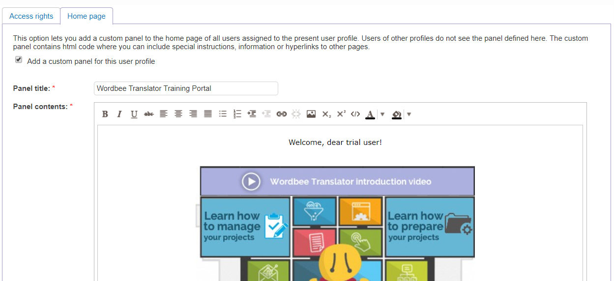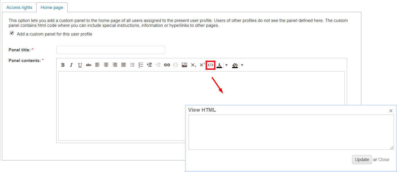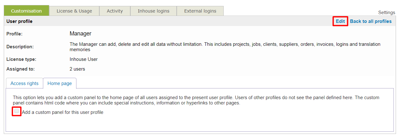 In the example above the Manager, the profile will be updated. When clicking on it and editing the page, you will need to check the box Add a custom panel for this user profile