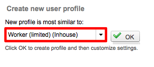 The profile will appear under a specific section of the list depending on which pre-defined user profile was used to create the new custom profile. In this example, the new custom profile titled "Worker (limited) 2" will appear underneath the Inhouse Profile section.