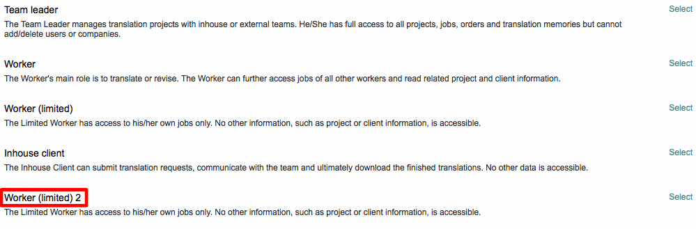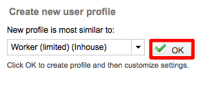 Then select the pre-defined (standard) user profile within Wordbee Translator that you would like to use for creating a custom profile. In this example, the inhouse Worker (limited) profile has been chosen.