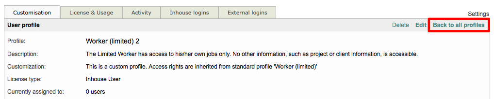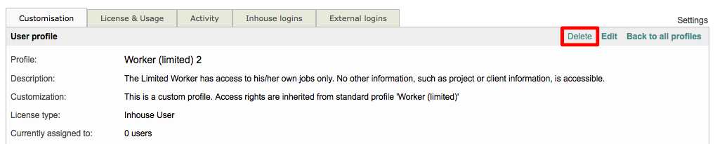 A profile may be deleted by clicking on Delete in the upper right of the screen; however, this action may not be possible when the profile is already in use by one or more user logins for Wordbee Translator.