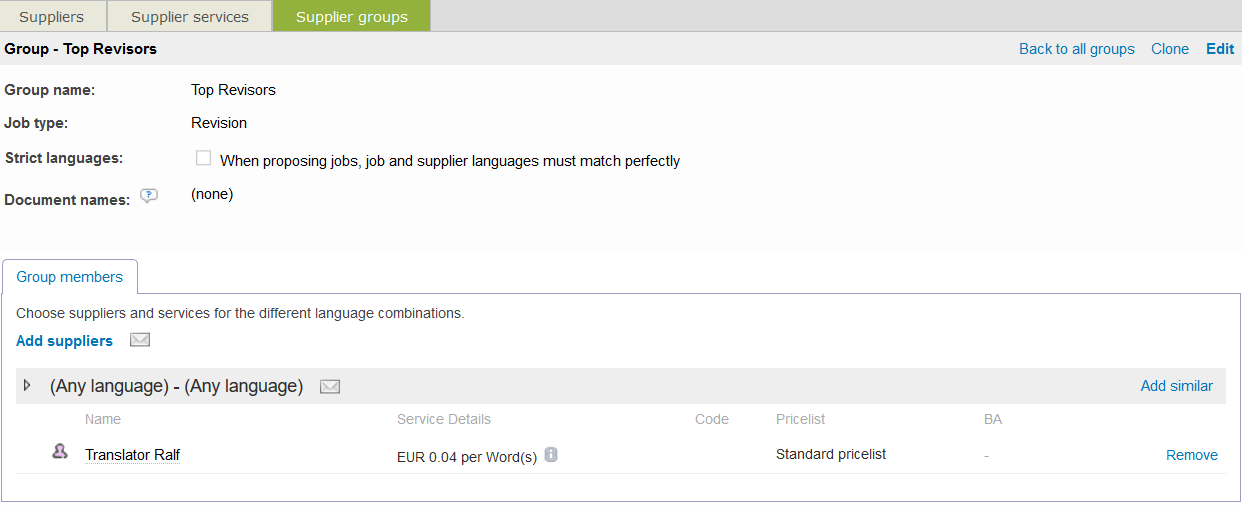 To ease the creation of new supplier groups you can also decide to clone an existing one and make modifications. All suppliers included in the original group will be available in the new created one, so you can make all arrangements needed.